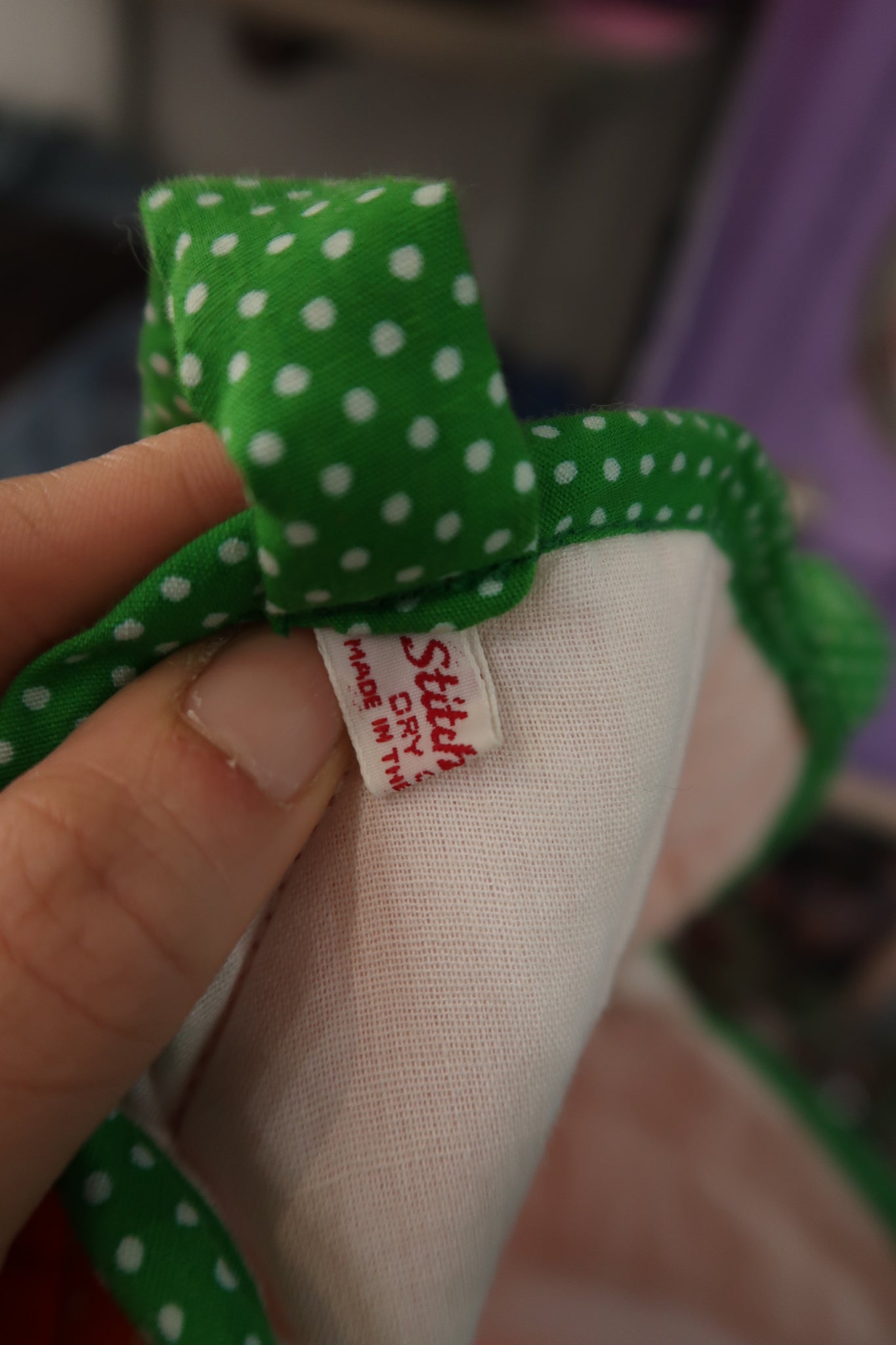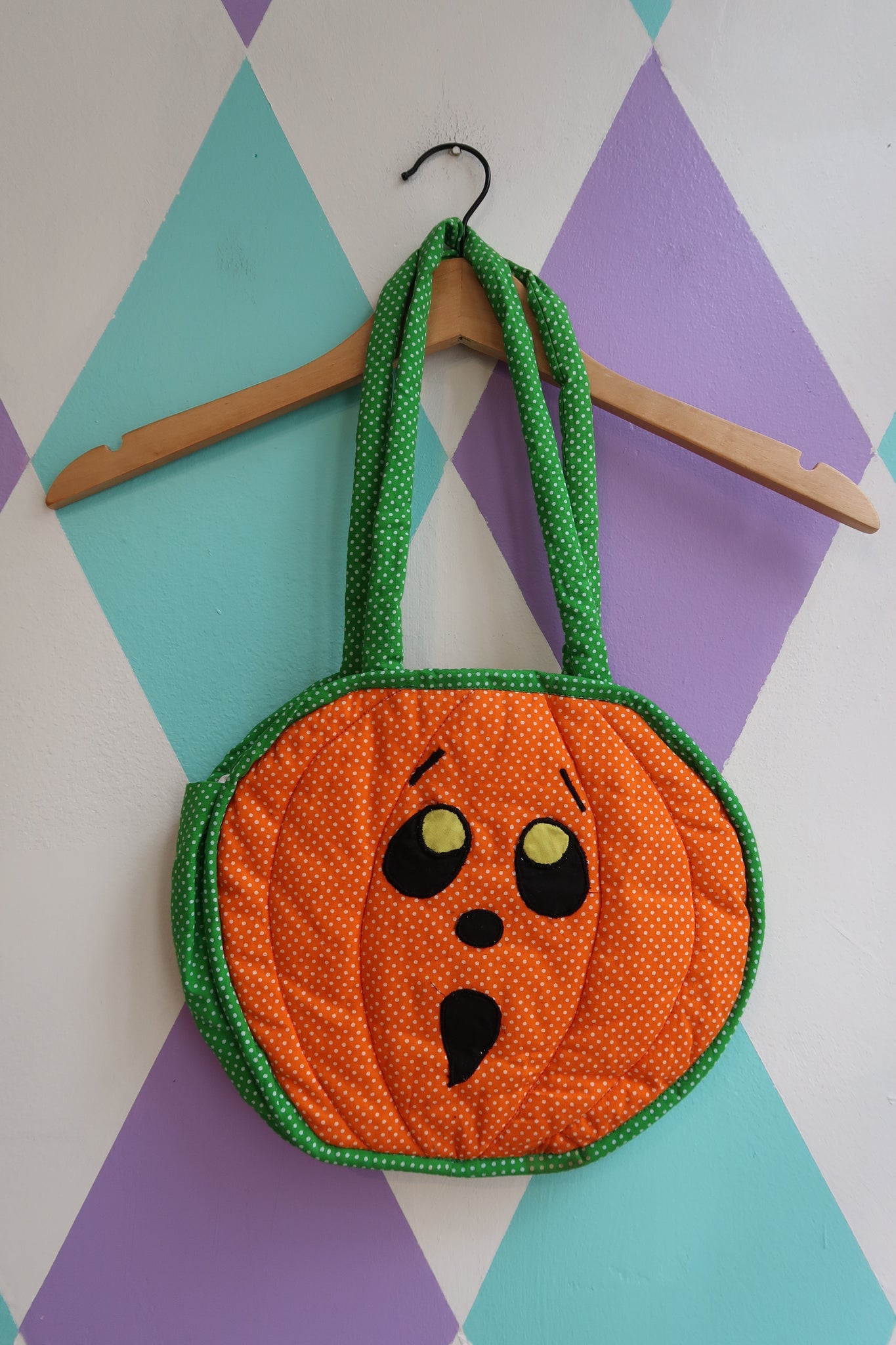 This vintage handmade Halloween tote bag features a charming pumpkin face design crafted from orange and green polka-dot quilted fabric. Softly padded with sturdy handles, it’s perfect for trick-or-treating, carrying candy, or festive decor.