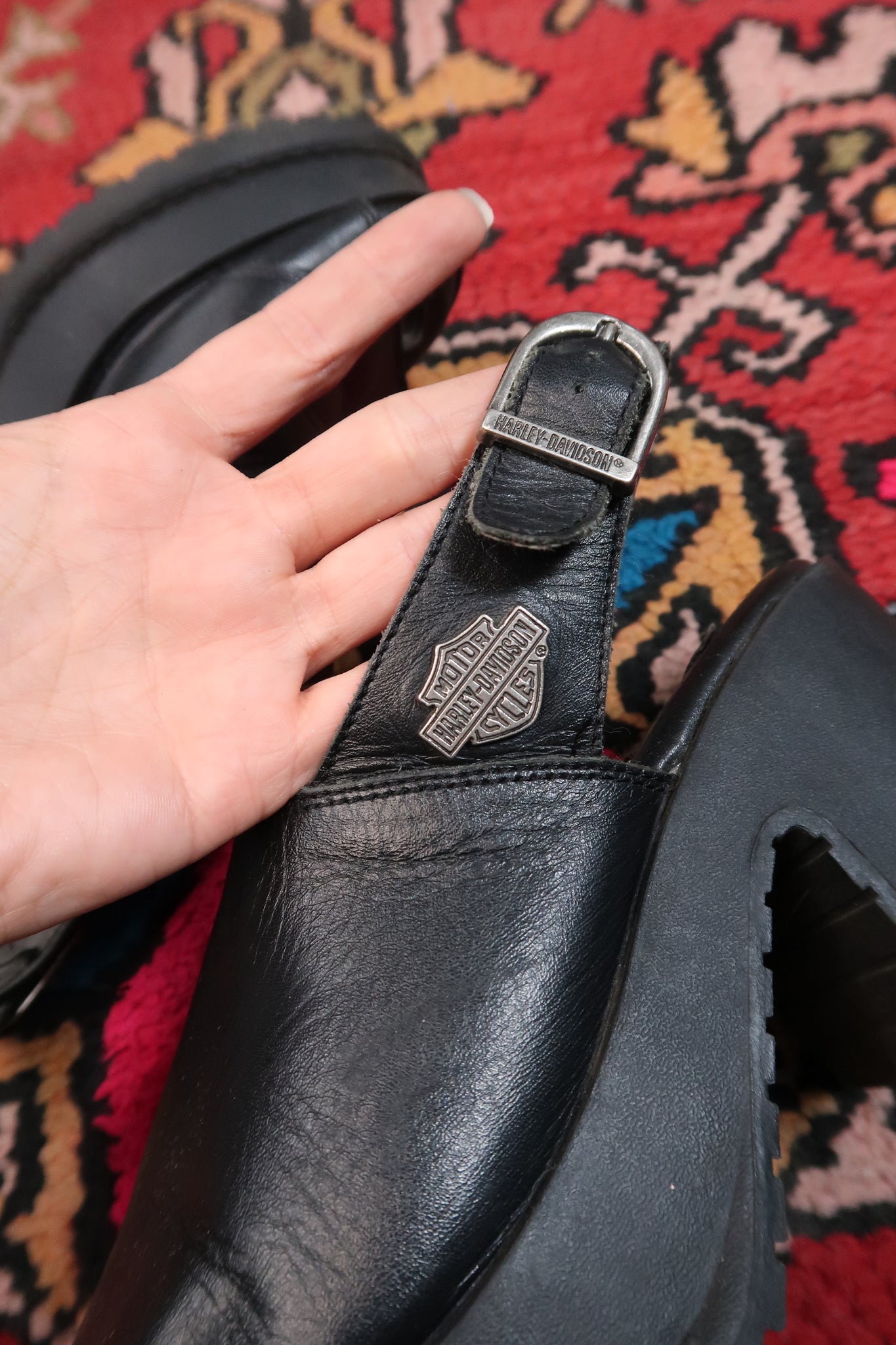 Vintage Harley Davidson Black Leather Platform Heels – Chunky Y2K Slingback Sandals