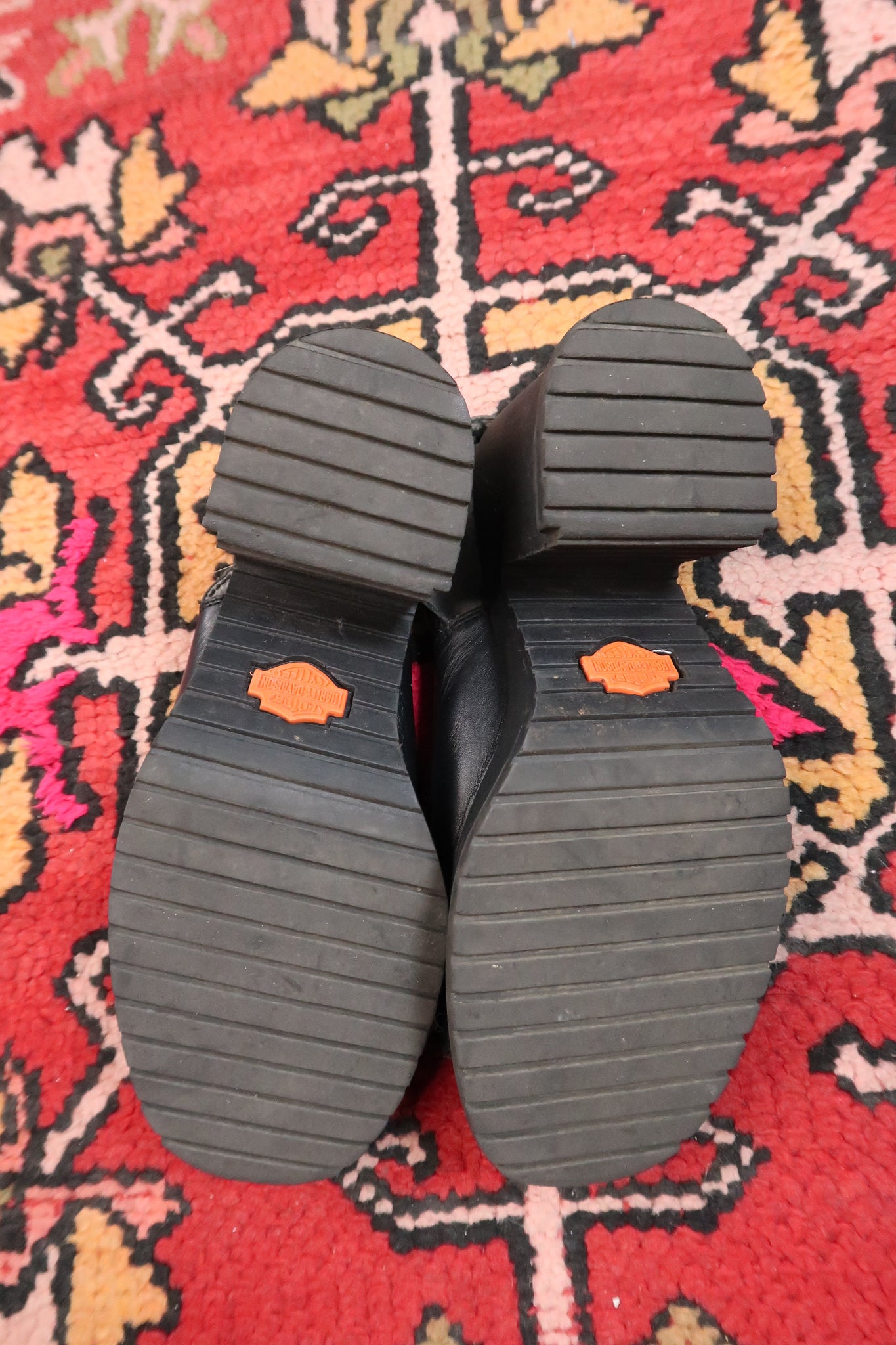 These vintage Harley Davidson heels channel edgy biker-chic energy with Y2K flair. Crafted from genuine black leather, they feature a chunky platform sole, peep-toe front, and slingback strap with buckle closure for a secure fit. The rugged treaded sole and bold block heel add attitude while staying wearable. Perfect for pairing with denim, leather jackets, or mini skirts, these heels are a rare vintage Harley Davidson find that blends tough utility with early 2000s style.