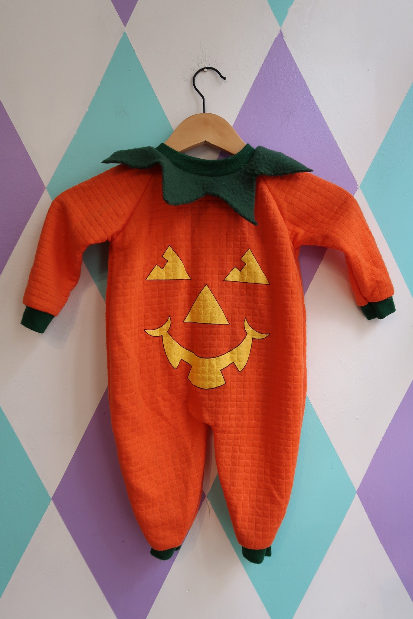 This vintage kids Halloween onesie features a classic jack-o’-lantern face on bright pumpkin orange fabric with green collar and cuffs, giving it a timeless festive charm. Soft, cozy, and perfect for trick-or-treating or fall photo ops, this piece captures nostalgic Halloween spirit.