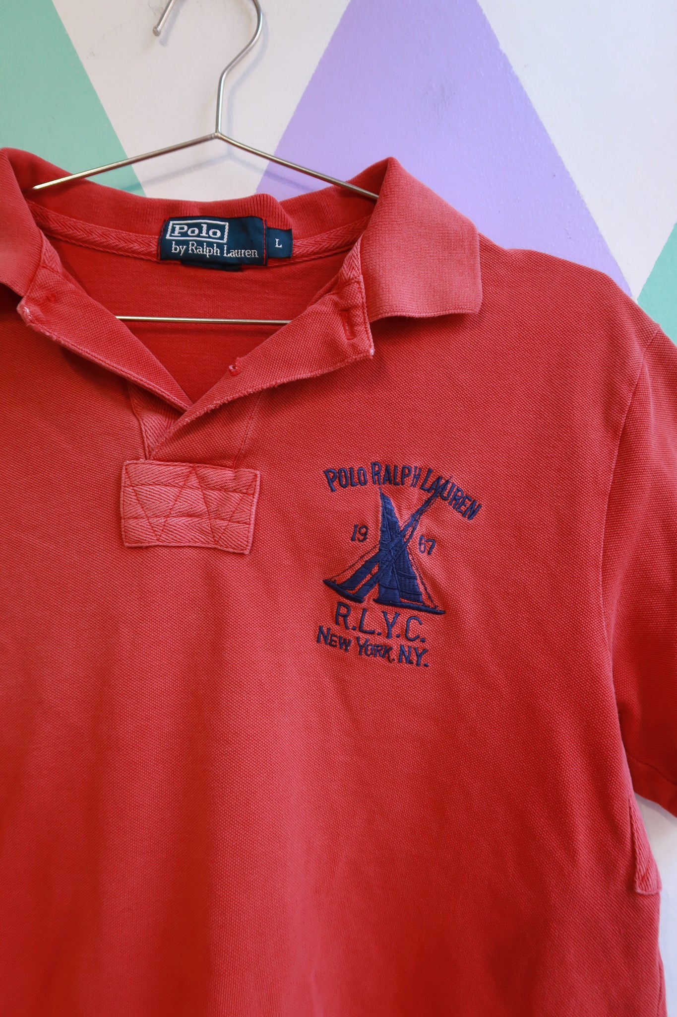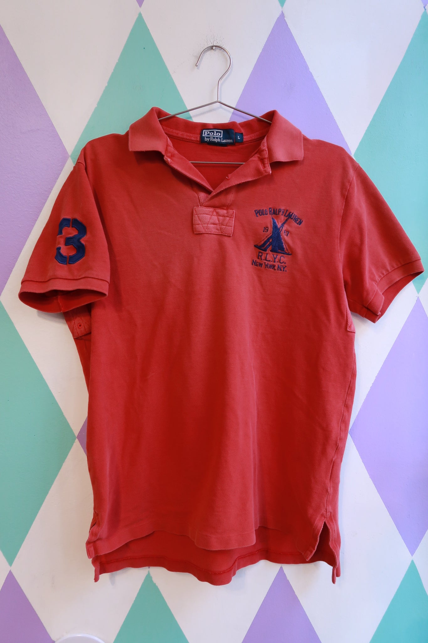 Classic vintage Polo Ralph Lauren polo shirt in saturated red cotton featuring a Ralph Lauren Yacht Club embroidered chest crest with nautical sailboat detailing and bold sleeve number appliqué. The soft cotton knit has a comfortable, worn-in feel, while the structured collar and button placket create a clean, sporty silhouette. The contrast embroidery and patch graphics add strong visual character, giving the shirt that signature 90s prep and yacht club aesthetic.