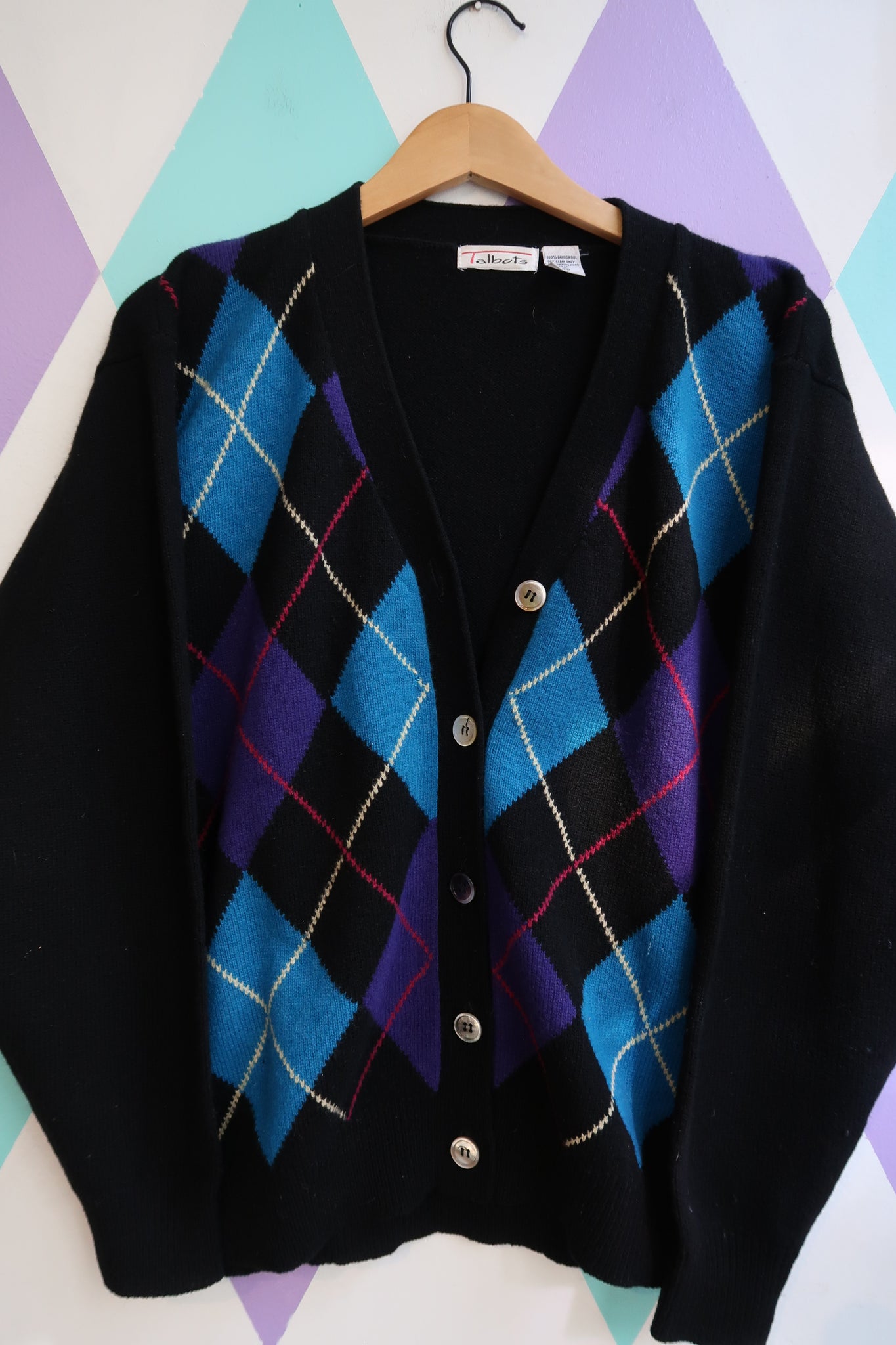 This vintage Talbots cardigan is crafted from 100% pure lambswool, offering soft warmth and a timeless preppy aesthetic. The front features a bold argyle pattern in shades of blue, purple, and turquoise against a classic black base, complemented by button-down closure and a deep V-neckline for easy layering.