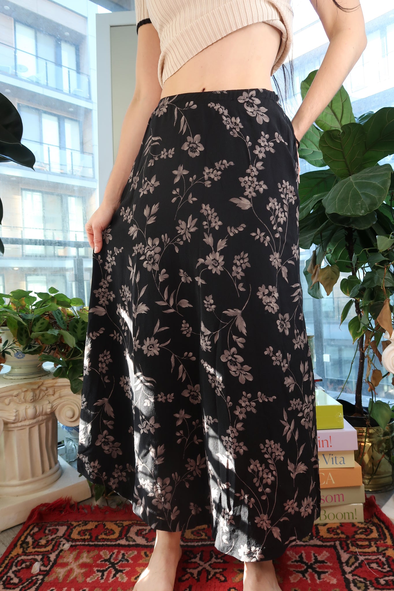 Elegant and fluid vintage 1990s maxi skirt crafted from 100% silk, featuring a soft black base with an allover muted taupe/grey floral vine print. The silhouette is long and drapey with a graceful straight-to-slightly-A-line fall that moves beautifully with wear. Clean, minimalist waistline creates a sleek fit through the hips before flowing into a full-length hem. Lightweight and airy with a naturally luxe sheen that’s unmistakably silk. A timeless, understated piece that works effortlessly for elevated casual wear or dressed-up evening looks.