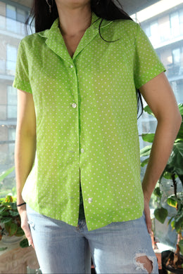 Vintage 70s Lime Green Polka Dot Button-Up Blouse — Short Sleeve Mod Top