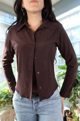 Vintage Y2K Chocolate Brown Long Sleeve Polo Top with Faux Suede Pockets