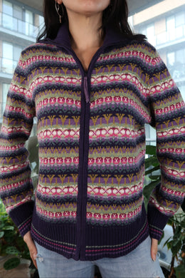 Vintage Fair Isle Zip-Up Sweater – Purple Multicolor Knit