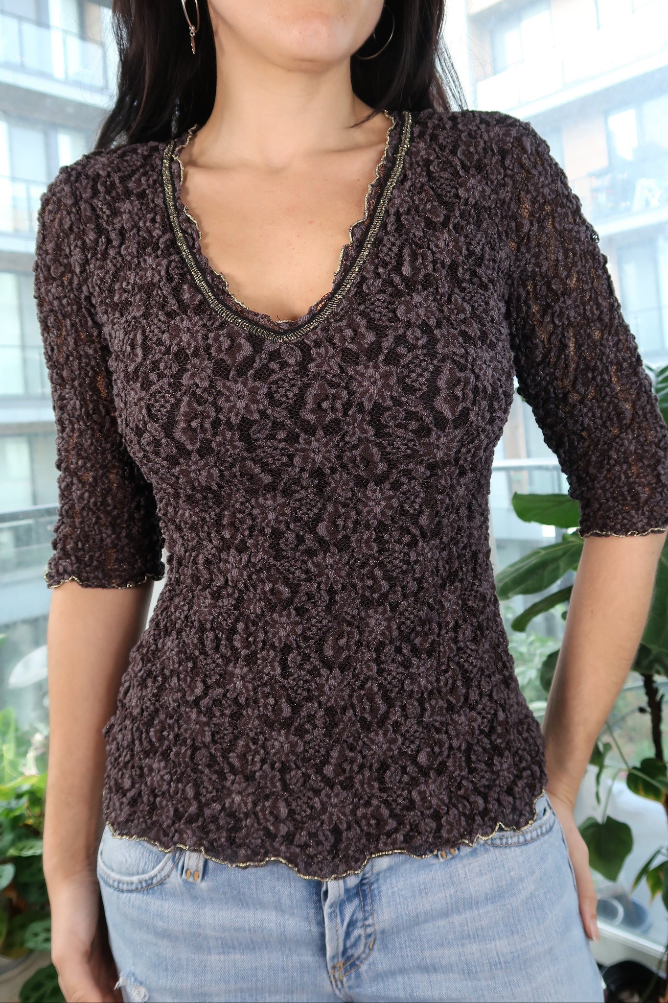 Elegant vintage 2000s lace top in a rich plum purple hue with an allover delicate lace texture that creates dimension and visual depth throughout. Designed with a soft V-neckline accented by subtle metallic-toned trim, adding a refined early-2000s detail without overpowering the look.