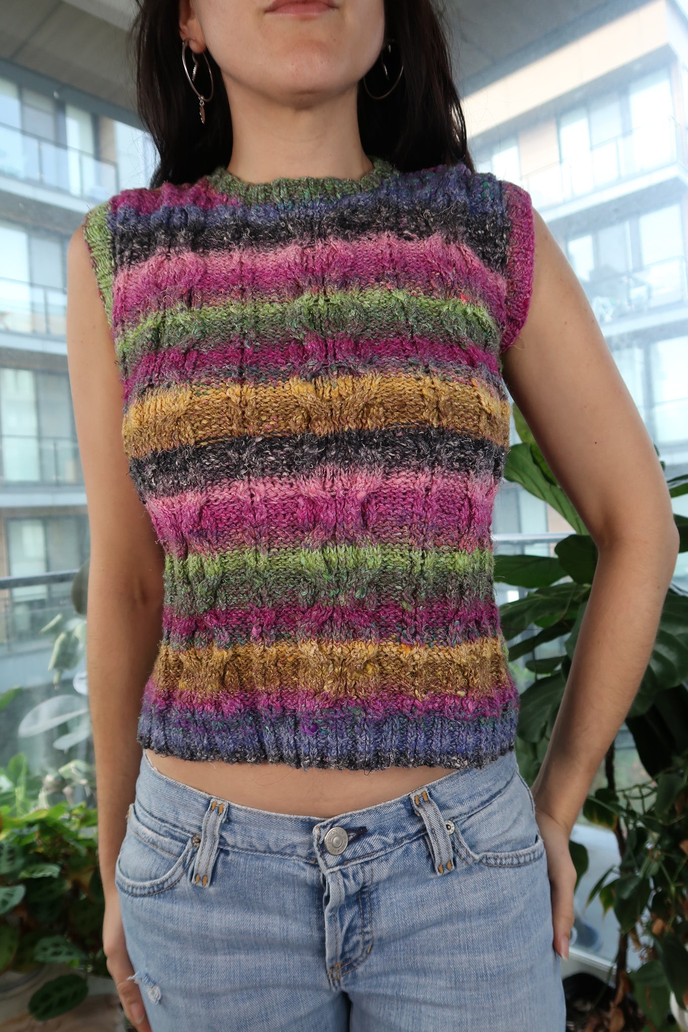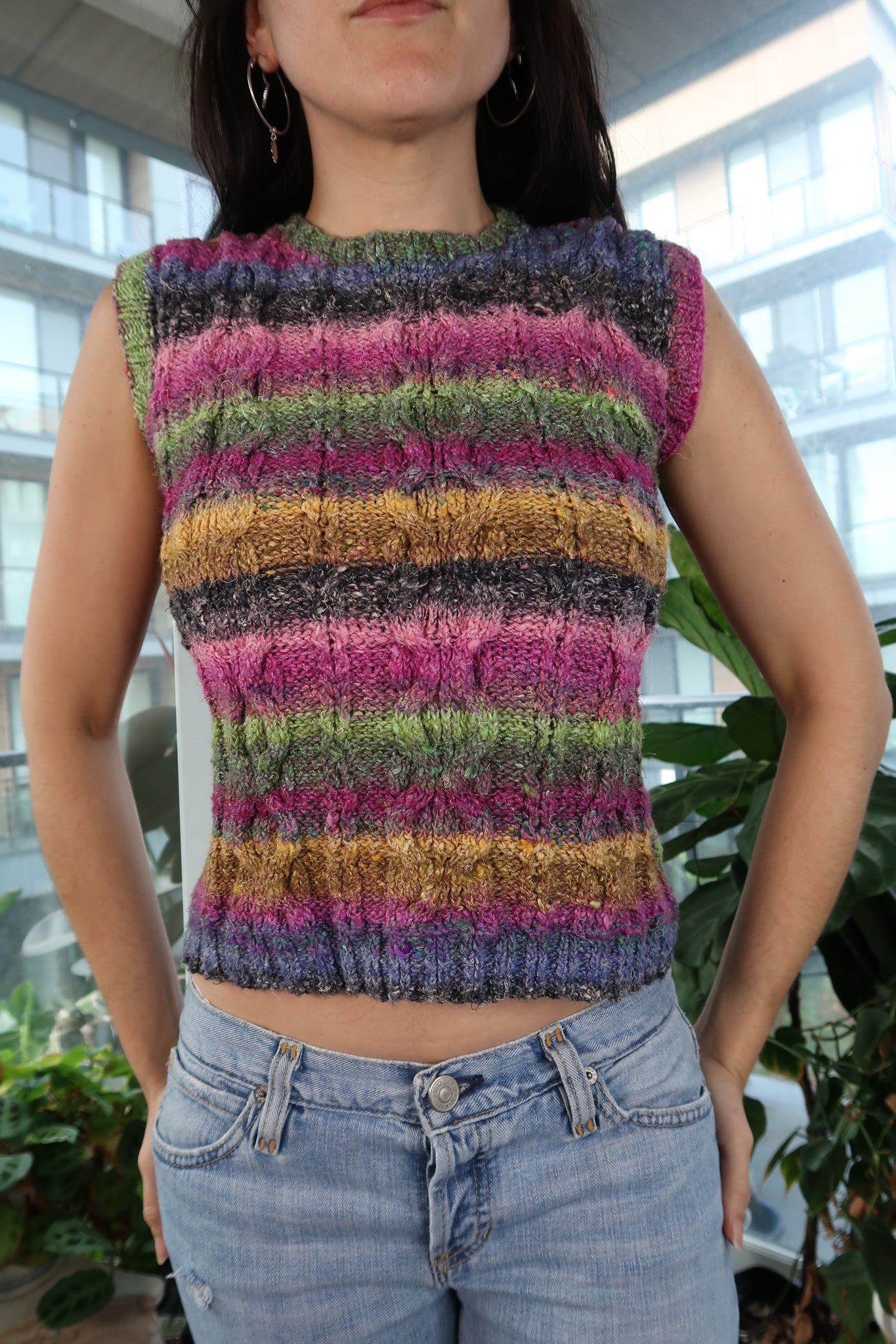 This hand-knit multicolor cable knit sleeveless sweater is a stunning one-of-a-kind piece featuring richly toned horizontal stripes in shades of pink, green, gold, purple, and charcoal. The visible cable knit detailing and artisanal construction give it a dimensional, textured look that stands out from machine-made styles. Its fitted, slightly cropped silhouette pairs perfectly with denim, skirts, layered tees, or jackets for year-round styling.