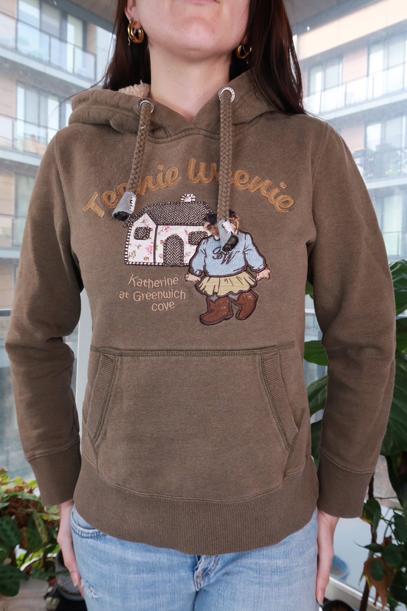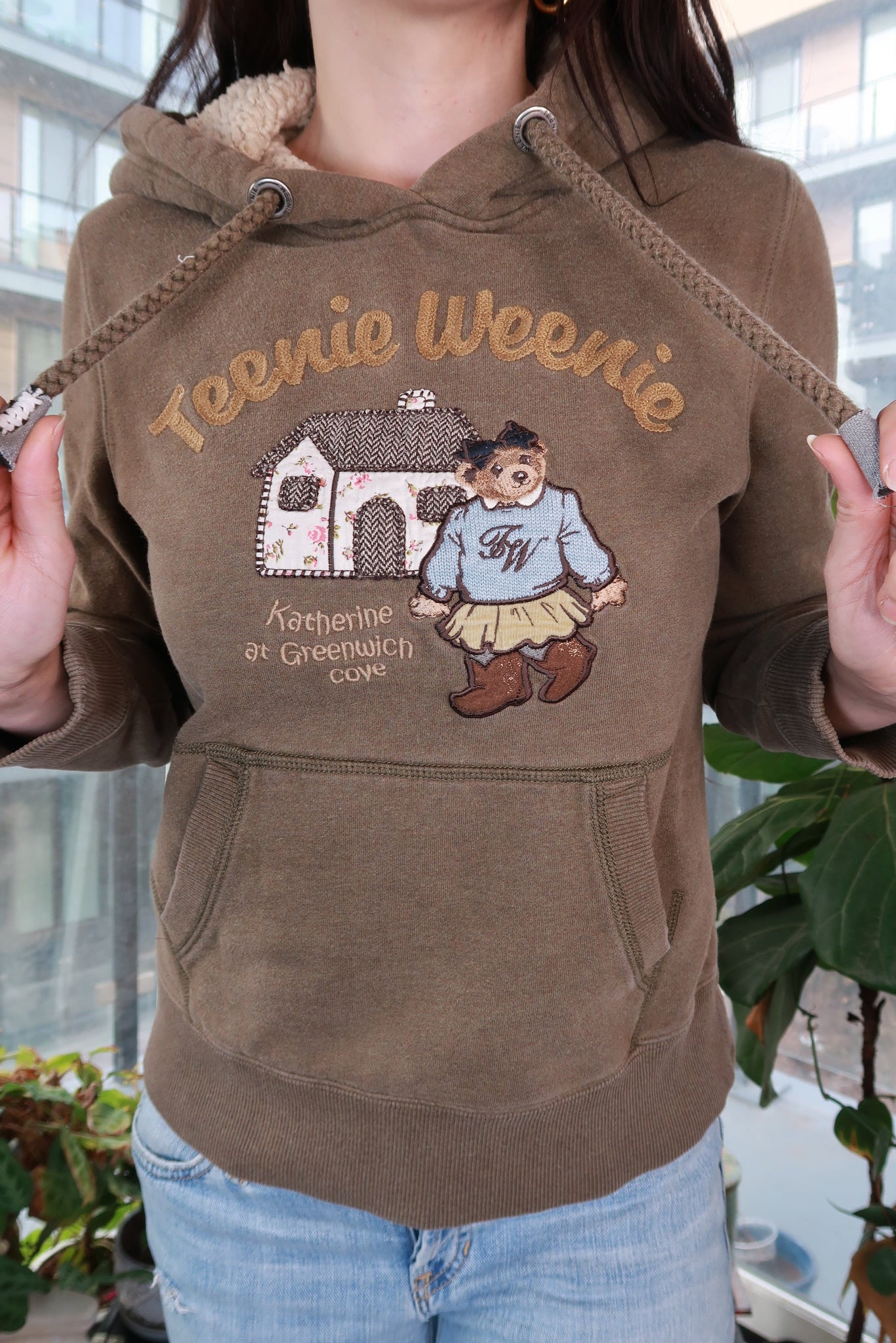 Vintage earthy brown pullover hoodie featuring a textured embroidered graphic reading “Teenie Weenie – Katherine at Greenwich Cove” with a storybook cottage and character applique design. Soft washed cotton feel with ribbed cuffs, kangaroo pocket, and thick drawstring hood. The detailed embroidery and muted neutral tone give cozy cottagecore, storybook, and nostalgic handmade aesthetic — perfect with worn-in denim or layered into autumn outfits.