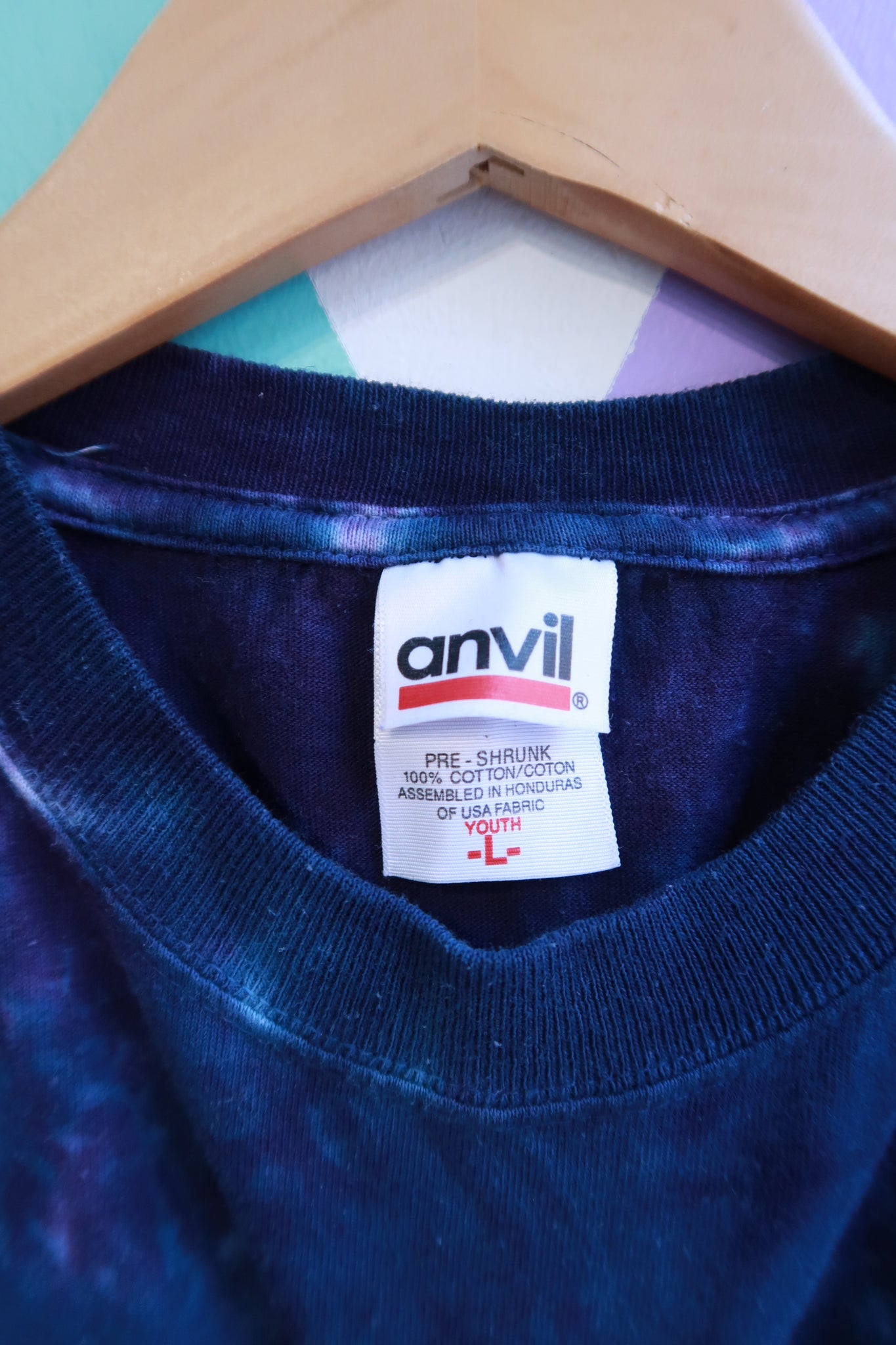 Vintage 2000s NASA graphic tee featuring a dramatic Apollo 11 astronaut print set against a deep blue tie-dye wash for bold space-inspired styling. The front graphic highlights the historic lunar landing with official-style patches and text referencing the National Air & Space Museum, creating strong early-2000s souvenir and science nostalgia. The astronaut artwork pops against the cloudy blue dye pattern, giving the shirt depth and visual impact.
