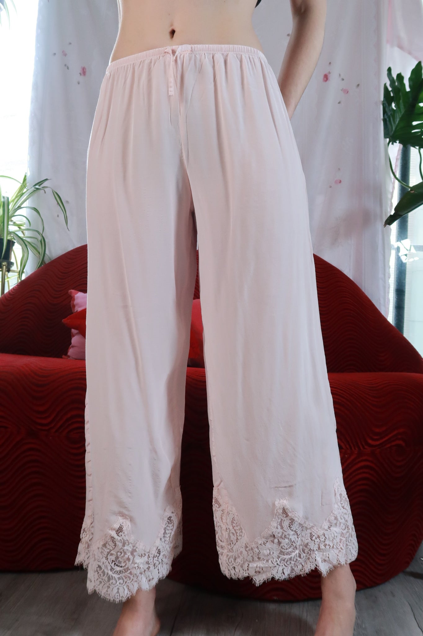 Victoria’s Secret lounge pants in a soft light blush pink featuring a smooth lightweight fabric that drapes fluidly for an airy, comfortable feel. The minimal front is finished with a delicate satin ribbon drawstring at the elastic waistband, giving a clean feminine look with a relaxed silhouette.