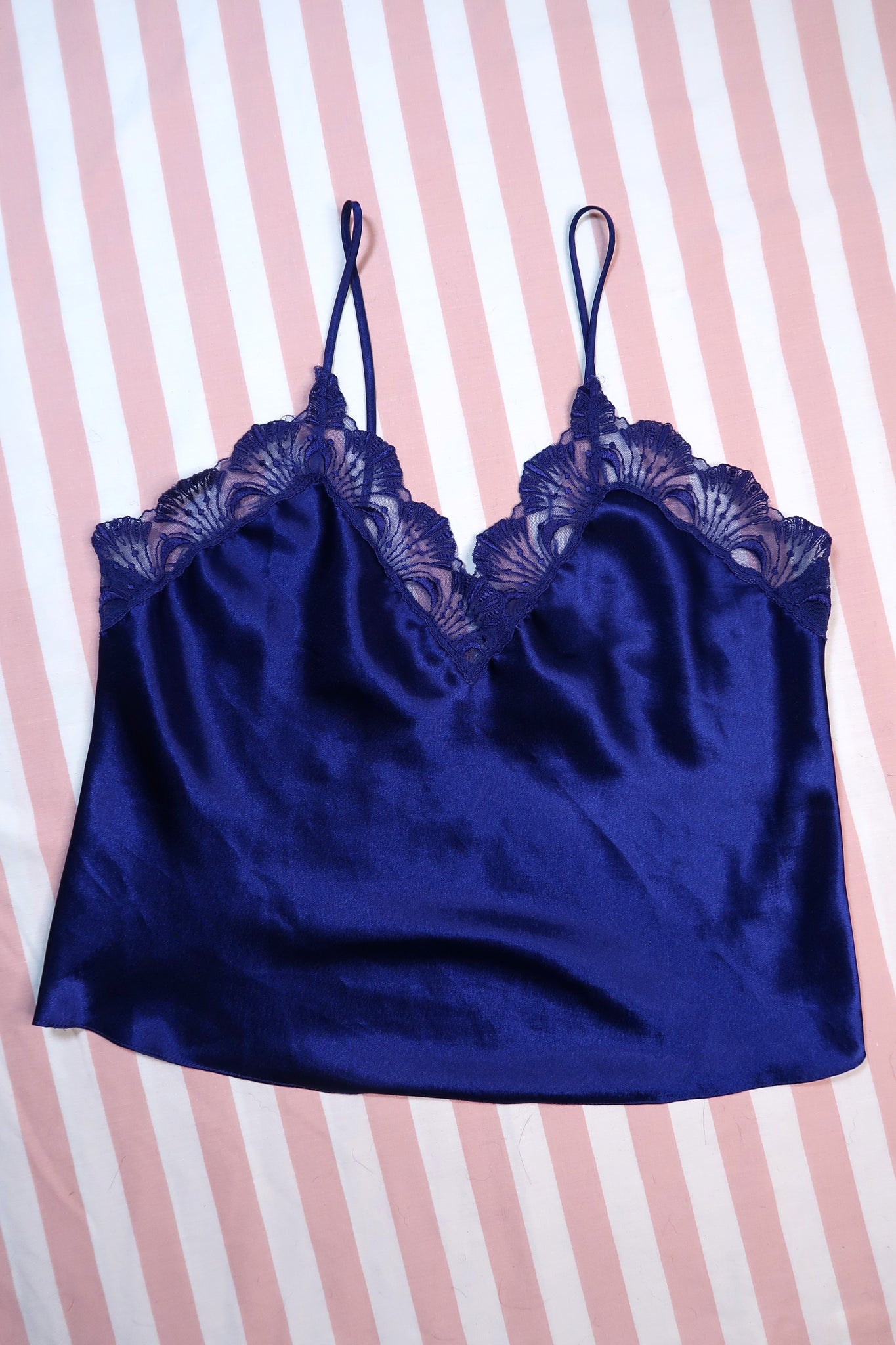 Thin spaghetti straps and the fluid satin construction give this piece unmistakable vintage Victoria’s Secret boudoir glamour — refined, minimal, and effortlessly flattering. The silky finish catches the light beautifully, emphasizing the smooth drape and body-skimming fit. Perfect worn as lingerie, lounge styling, or layered as a statement vintage cami.