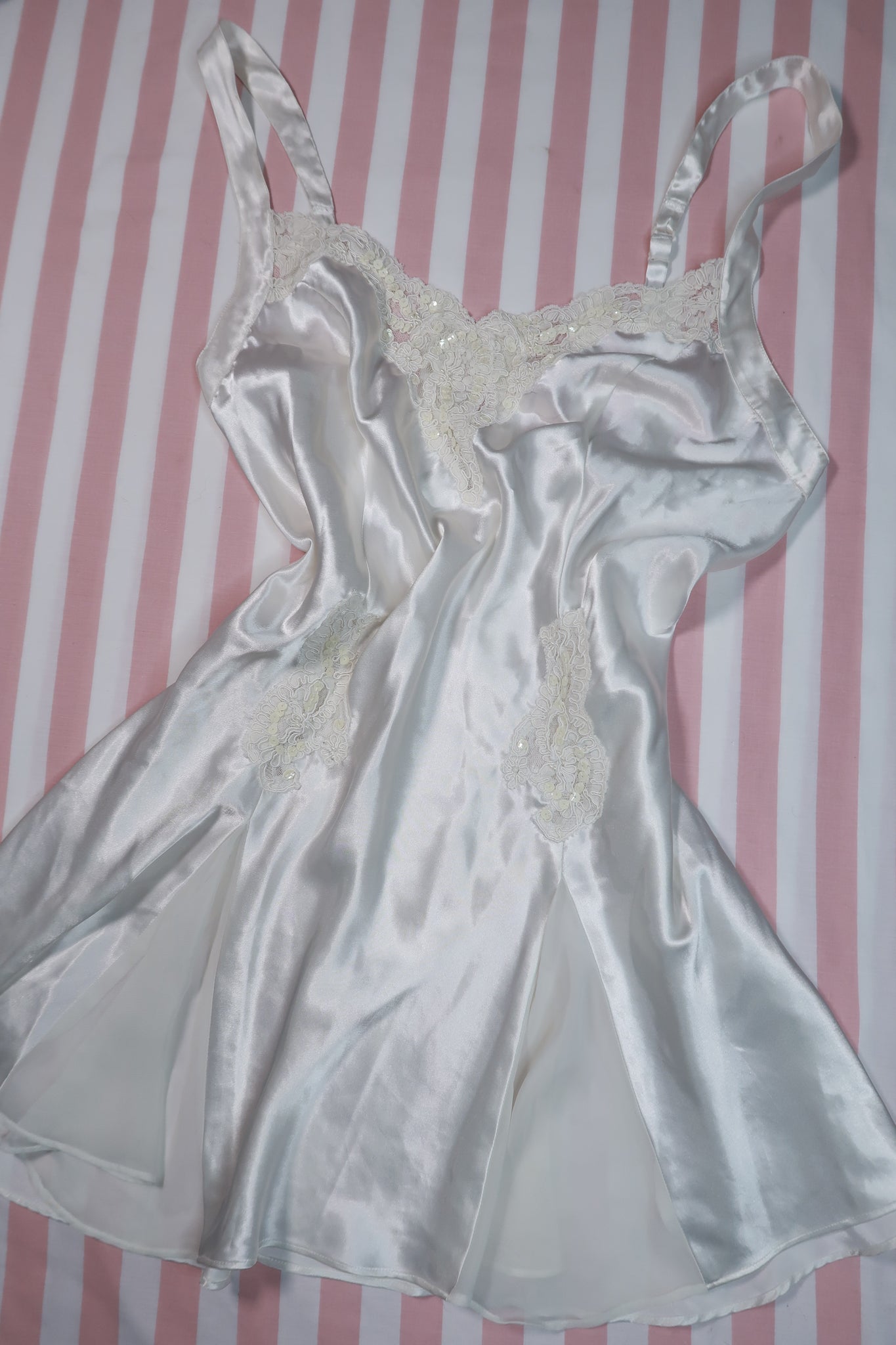 Romantic vintage 1990s Victoria’s Secret satin slip dress in luminous white with ornate lace panel detailing that gives it a sculpted, lingerie-inspired silhouette. The satin has a glossy, liquid-like sheen that catches the light beautifully, while the lace-trimmed V neckline creates a soft, feminine focal point. Matching lace appliqué panels at the hips visually contour the waist and add classic vintage boudoir elegance.