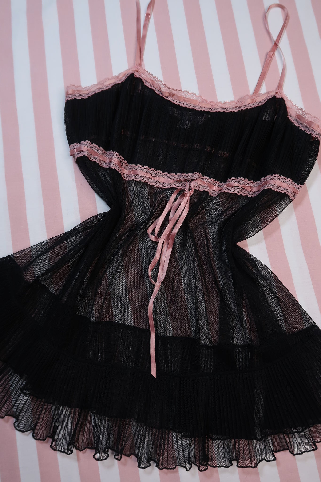 The lightweight mesh body flows into a pleated babydoll hem that drapes away from the torso, creating airy volume and flirty texture. Thin spaghetti straps and the semi-sheer construction give this piece unmistakable early-2000s Victoria’s Secret boudoir energy — romantic, playful, and designed for layering. Perfect worn as lingerie, lounge styling, or styled as a statement Y2K camisole top.