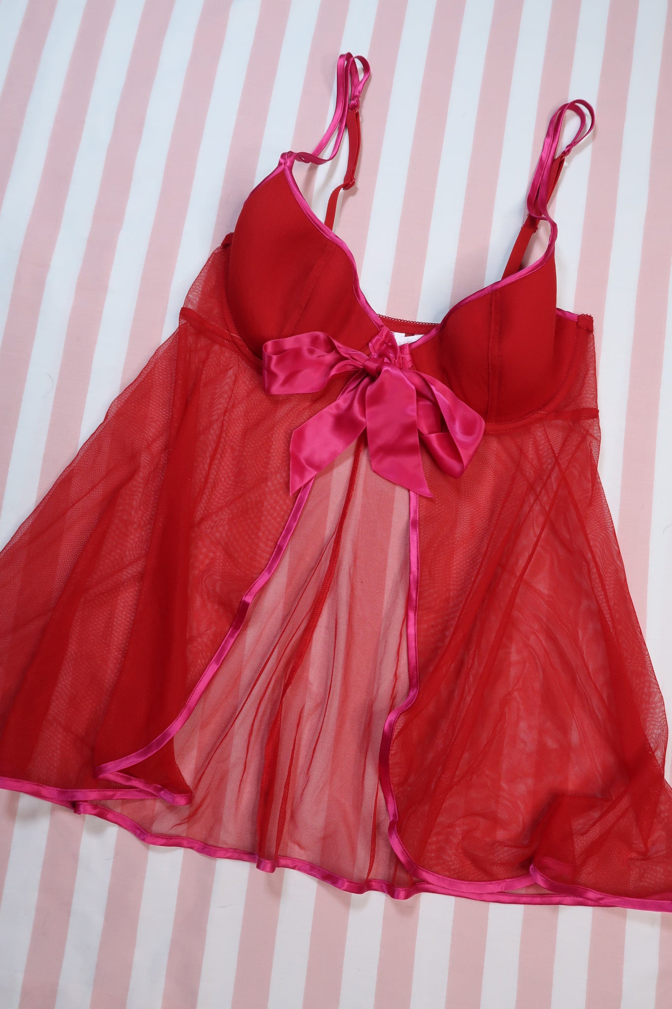 Playful vintage 2000s Victoria’s Secret sheer mesh babydoll top in vibrant red with hot pink satin bow detailing and signature Y2K lingerie styling. The triangle bust is lightly structured with a textured finish that adds shape and contrast, while the flowing sheer mesh body opens into a split front for movement and flirty layering. A bold satin bow at the center bust creates a statement focal point, giving the piece unmistakable early-2000s Victoria’s Secret energy.