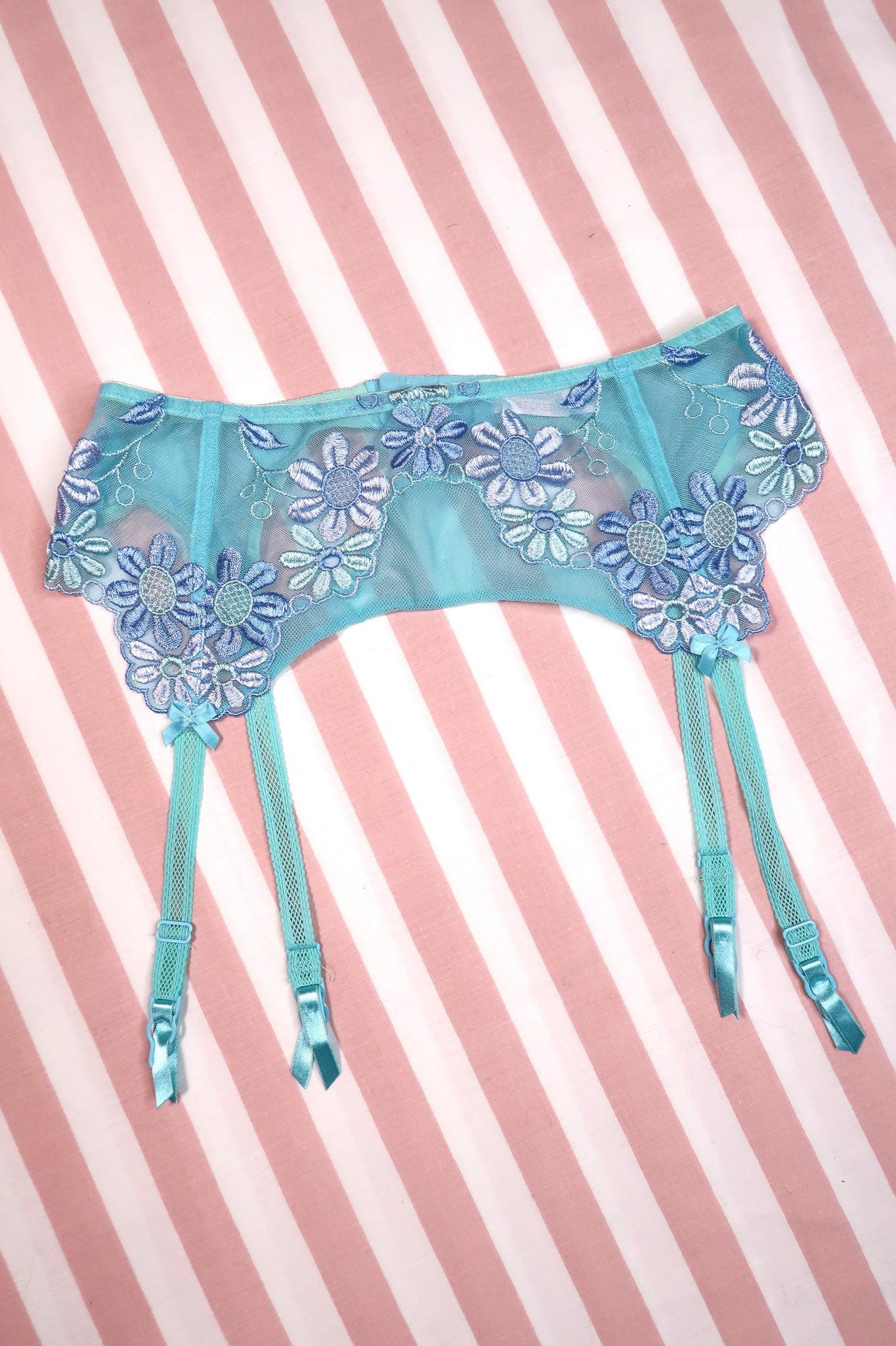 Vintage 2000s Victoria’s Secret Aqua Blue Embroidered Floral Garter Belt with Matching Satin Thong Two-Piece Lingerie Set