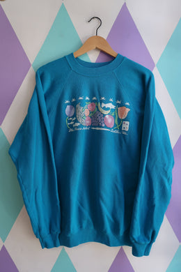 • Vintage 90s Pike Place Market Seattle Crewneck – Bright Teal Fruit & Fish Graphic