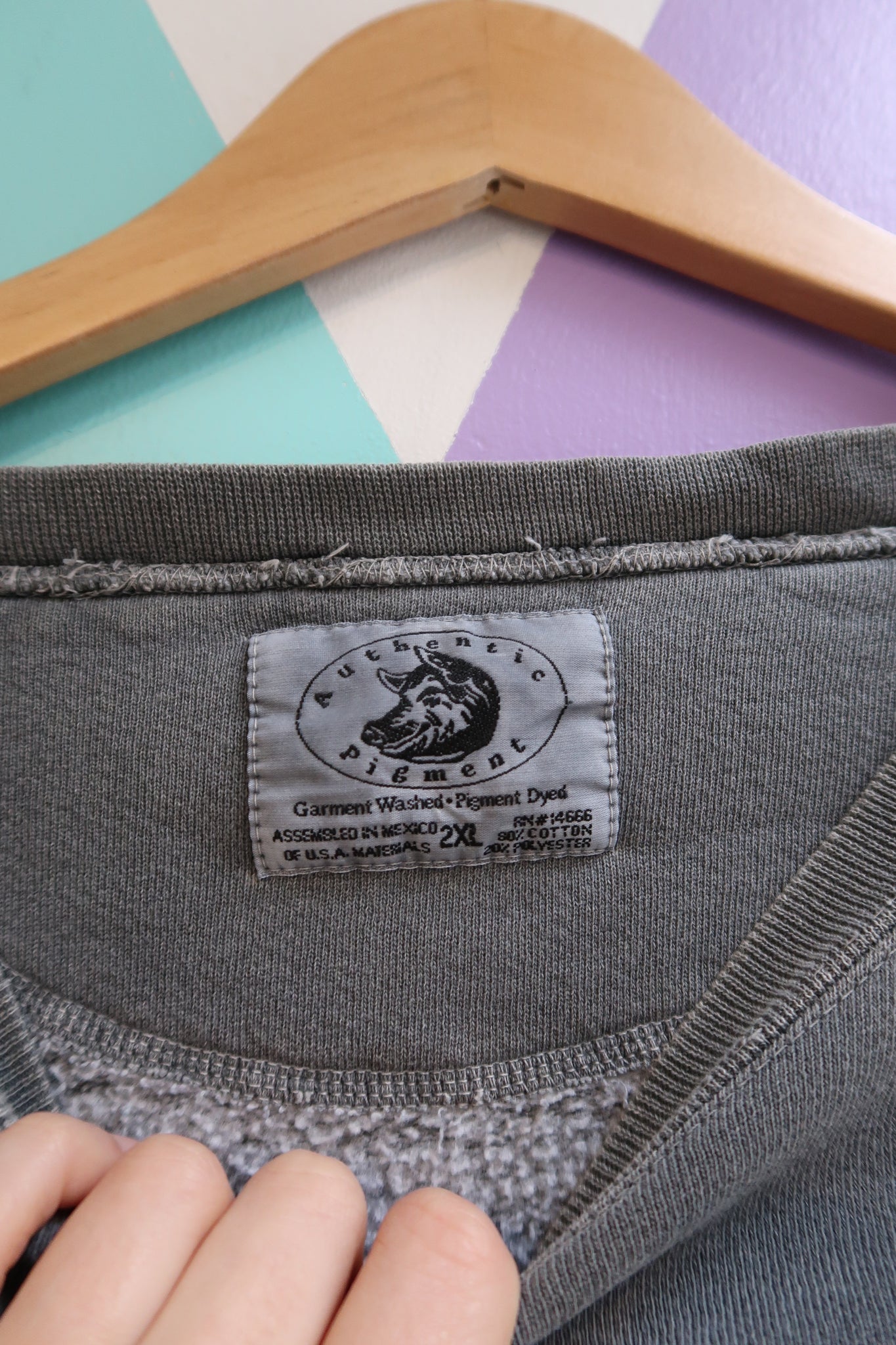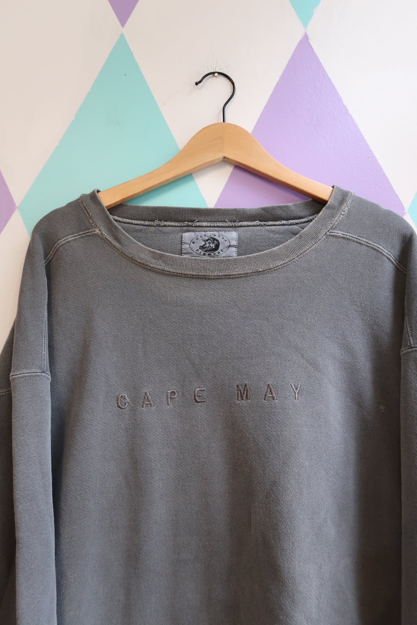 Cozy vintage Cape May sweatshirt in a soft, faded slate gray with minimalist tonal embroidered lettering across the chest. Made from heavyweight cotton-blend fleece with a perfectly worn-in feel and relaxed, oversized fit.