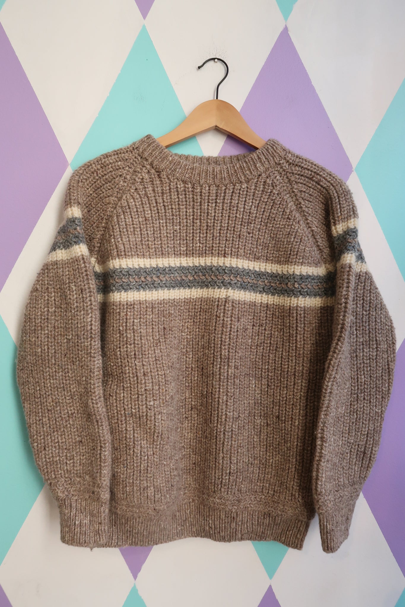 Cozy, earthy, and beautifully handmade—this vintage hand-knit wool sweater brings that classic, lived-in feel only true vintage can deliver. Done in a warm heathered taupe with a simple cream and gray stripe across the chest and sleeves, it has that perfectly slouchy, rustic look. The chunky ribbed knit adds texture and warmth without any braid or cable patterning, keeping the overall style clean, minimal, and outdoorsy. Finished with thick ribbed cuffs, hem, and neckline.
