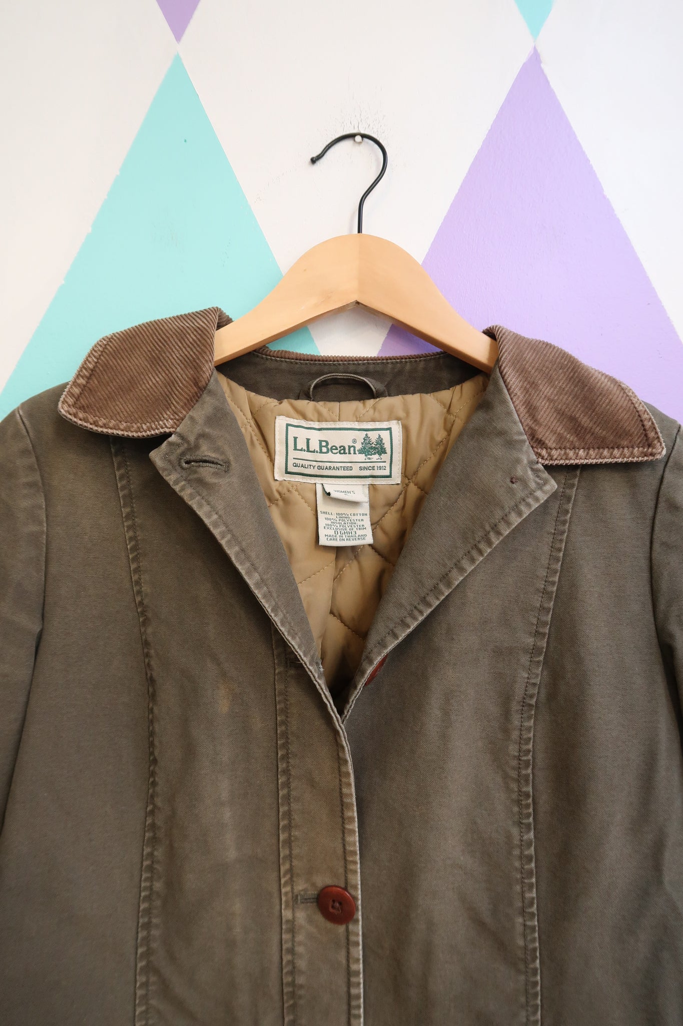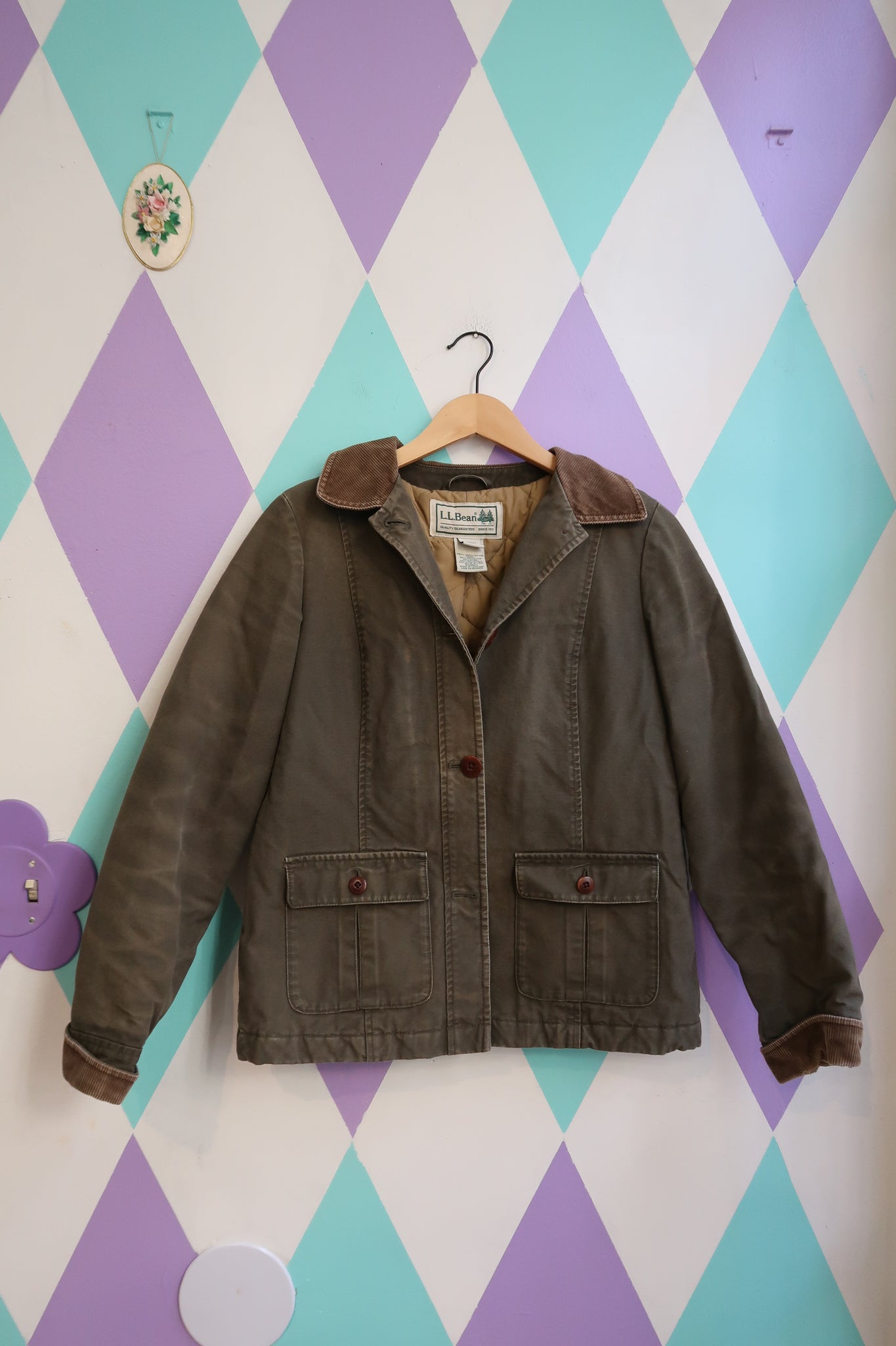 Vintage L.L. Bean canvas barn jacket in classic olive green with a brown corduroy collar and cuffs. Features button-front closure, two large flap pockets, and reinforced seam detailing for durability. The interior is lightly lined for warmth, making it perfect for transitional weather.